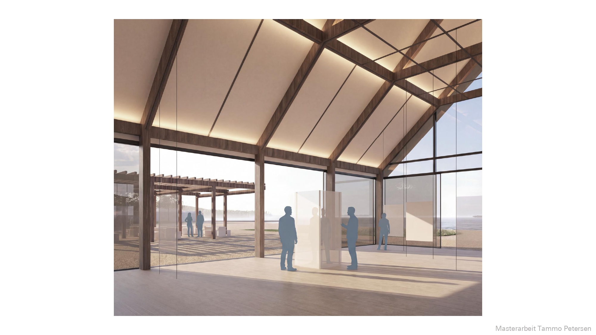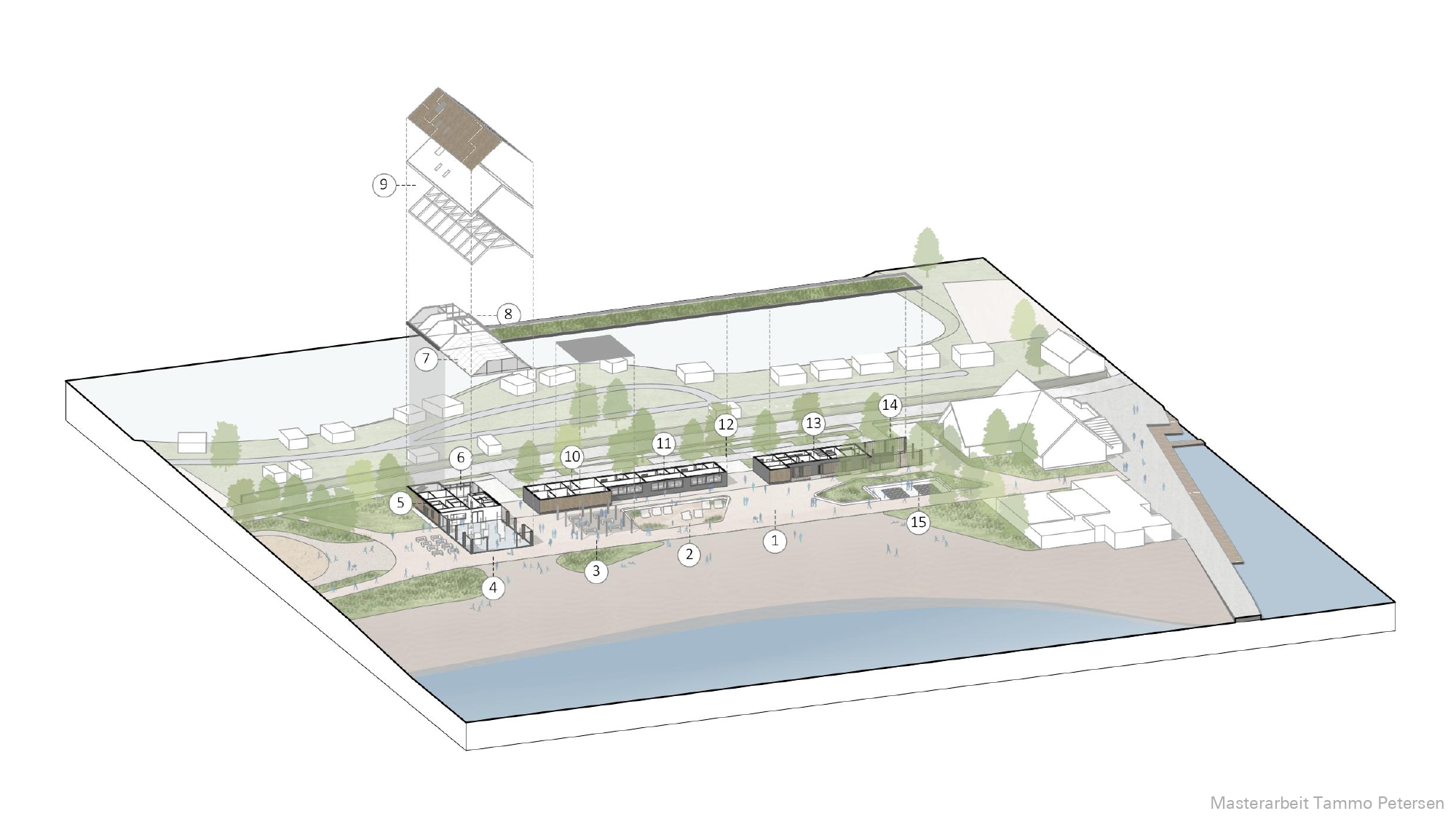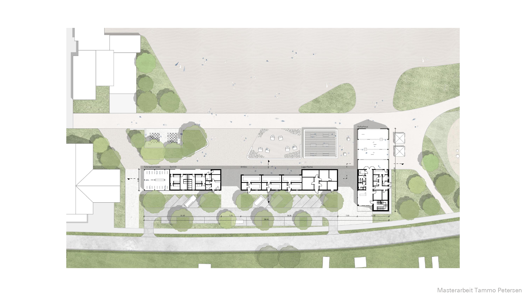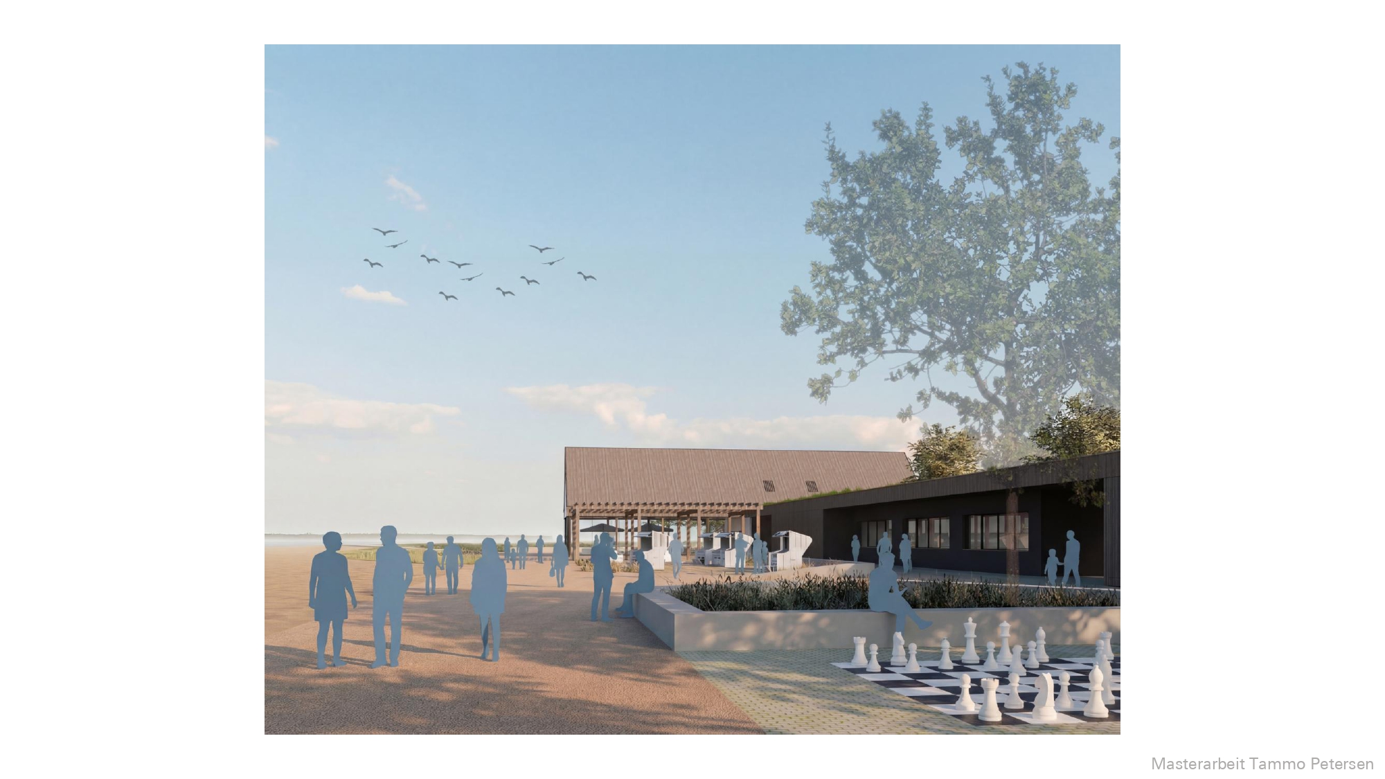 Durch die gezielte Setzung der Baukörper wird ein zentraler Platz zwischen Strand und Straße ausgebildet, der als Ankunfts- und Aufenthaltsort dient. Ergänzende, zurückhaltende Baukörper wie Imbisse und Sanitäranlagen werden integriert, während das Kulturhaus als identitätsstiftender Schwerpunkt einen räumlichen und programmatischen Akzent setzt. So entsteht ein klar strukturierter, robuster Ort, der sowohl saisonal als auch im Alltag funktioniert.