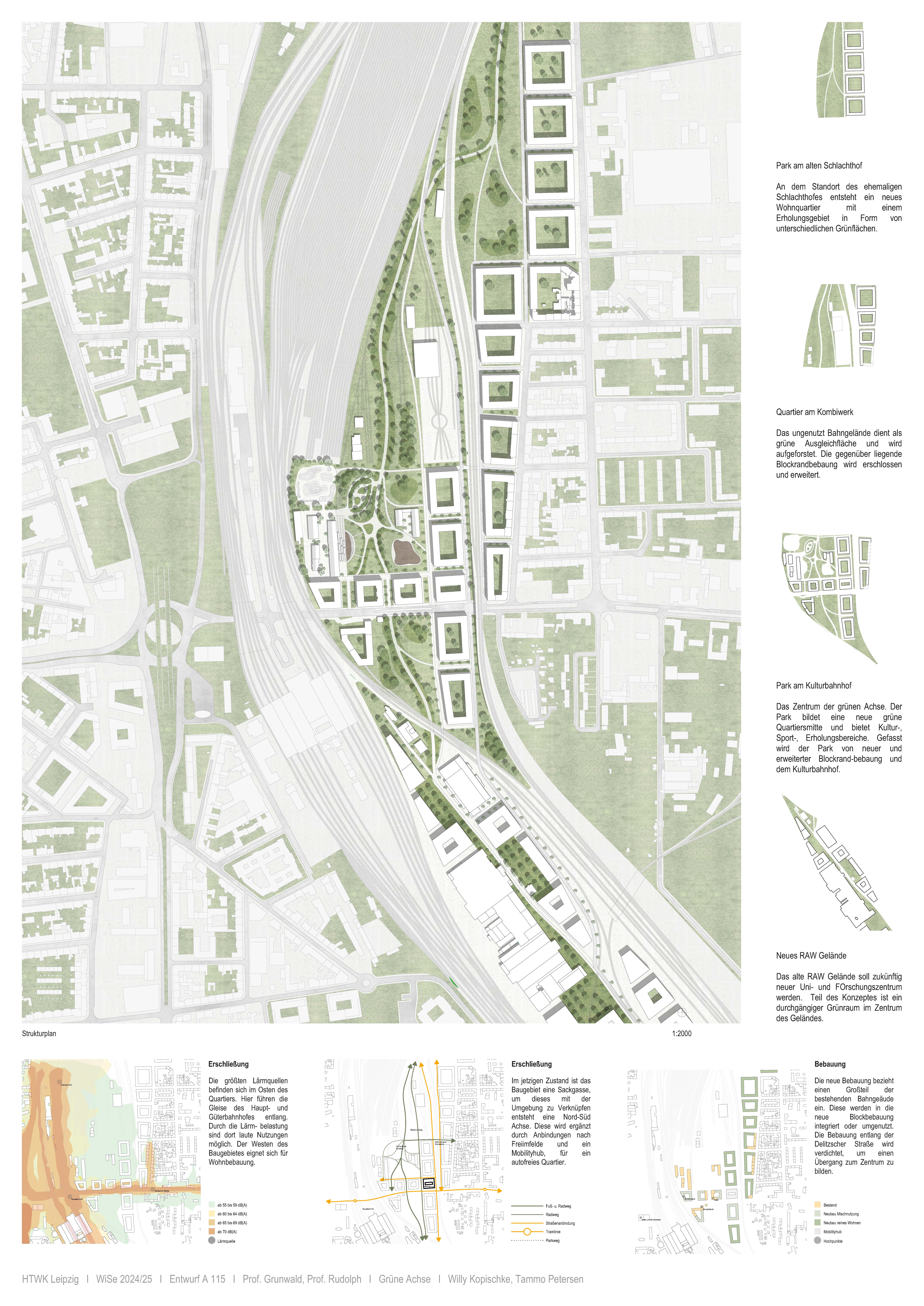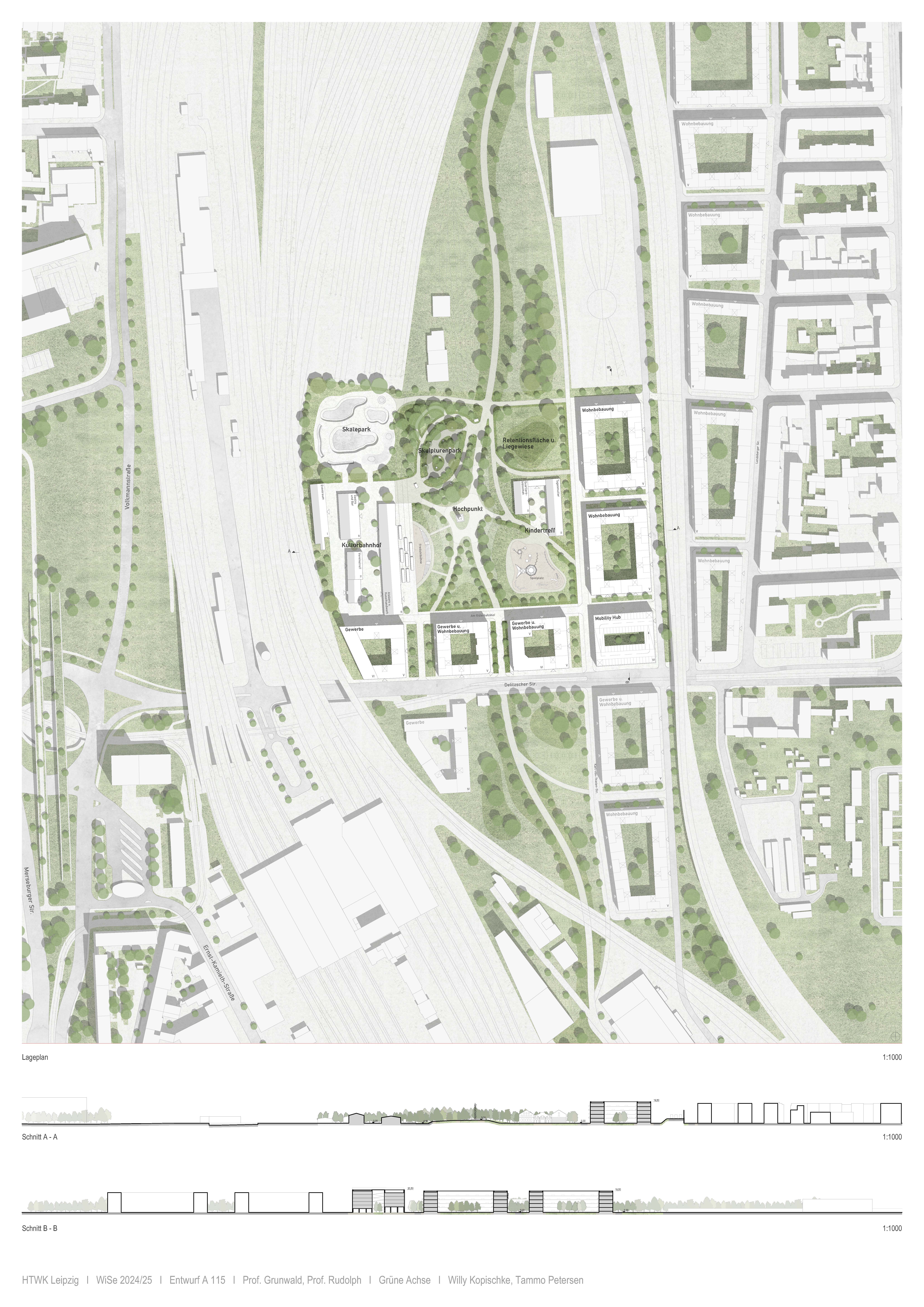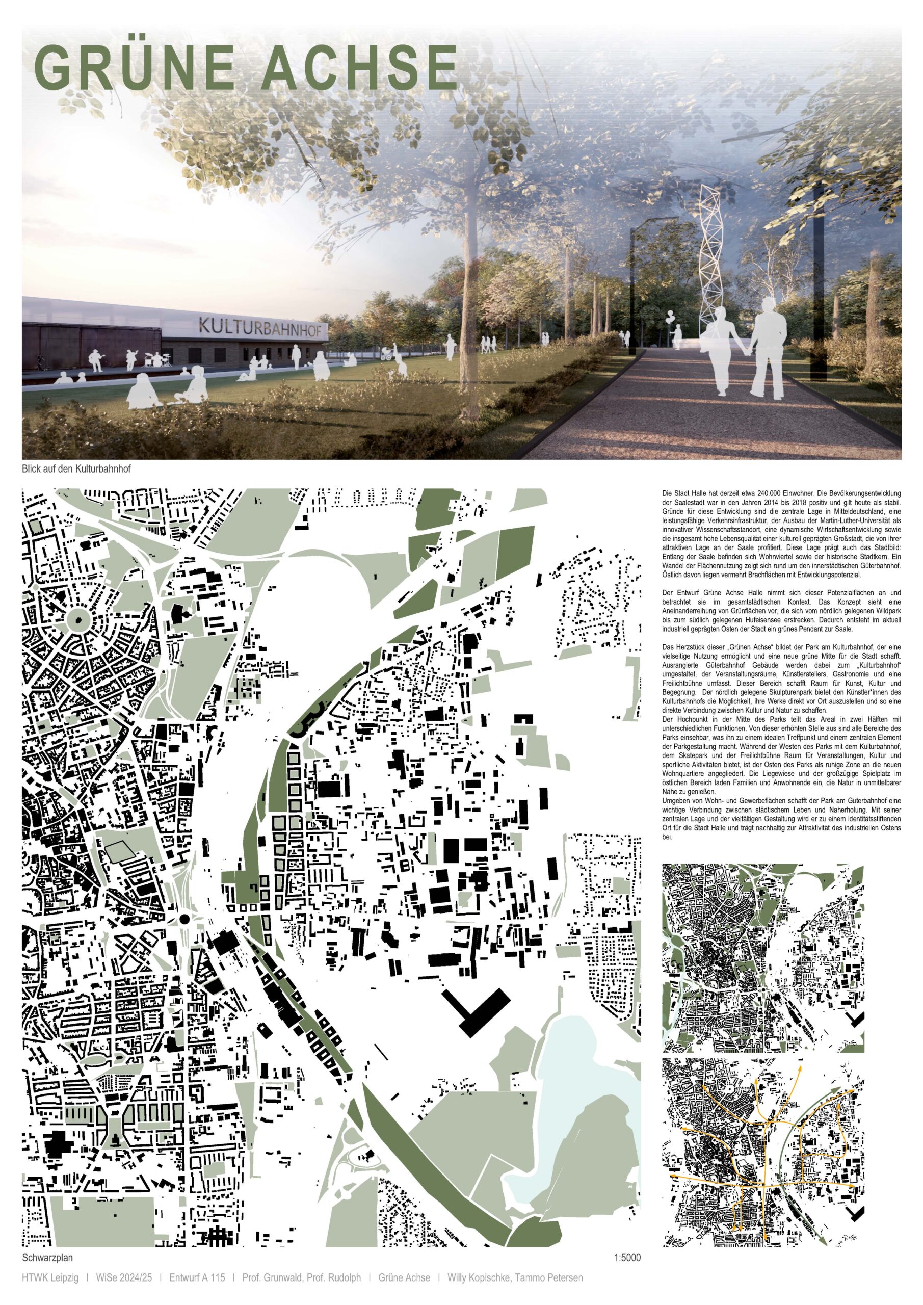 Der Entwurf „Grüne Achse Halle“ nutzt diese Flächen und verbindet sie zu einem durchgehenden Grünzug vom Wildpark bis zum Hufeisensee – als grünes Pendant zur Saale im Osten der Stadt. Herzstück ist der Park am Kulturbahnhof, in dem ehemalige Bahnhofsgebäude zu einem Ort für Kultur, Veranstaltungen und Gastronomie umgenutzt werden, ergänzt durch einen Skulpturenpark.