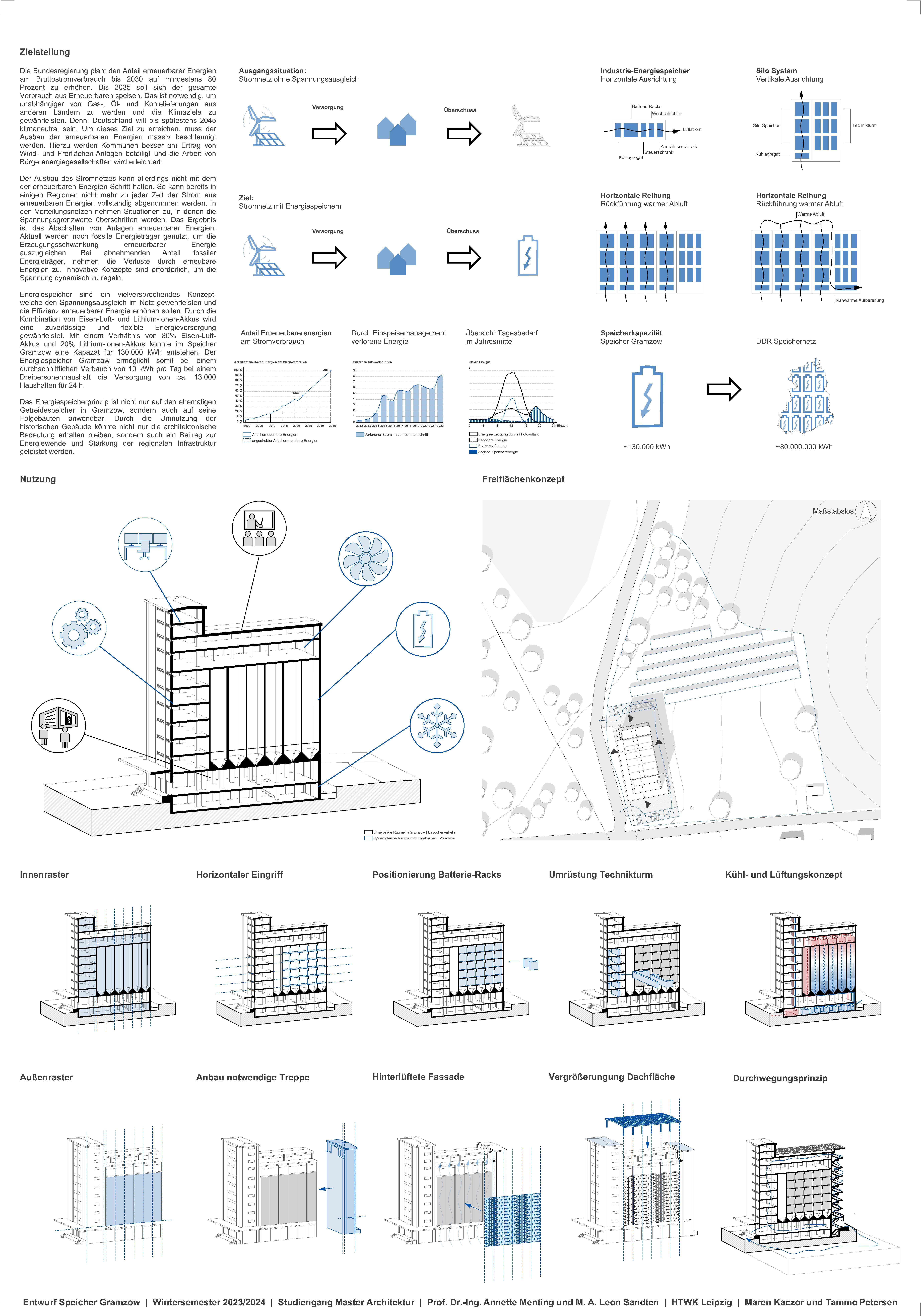 Der Entwurf greift diese Entwicklung auf und versteht die Umnutzung des Getreidespeichers als Chance, das historische Bauwerk zu erhalten und zugleich in ein modernes Energiesystem zu integrieren. Als Energiespeicher kann er künftig Schwankungen erneuerbarer Energien ausgleichen und so zur Stabilisierung und Effizienz der regionalen Energieversorgung beitragen.