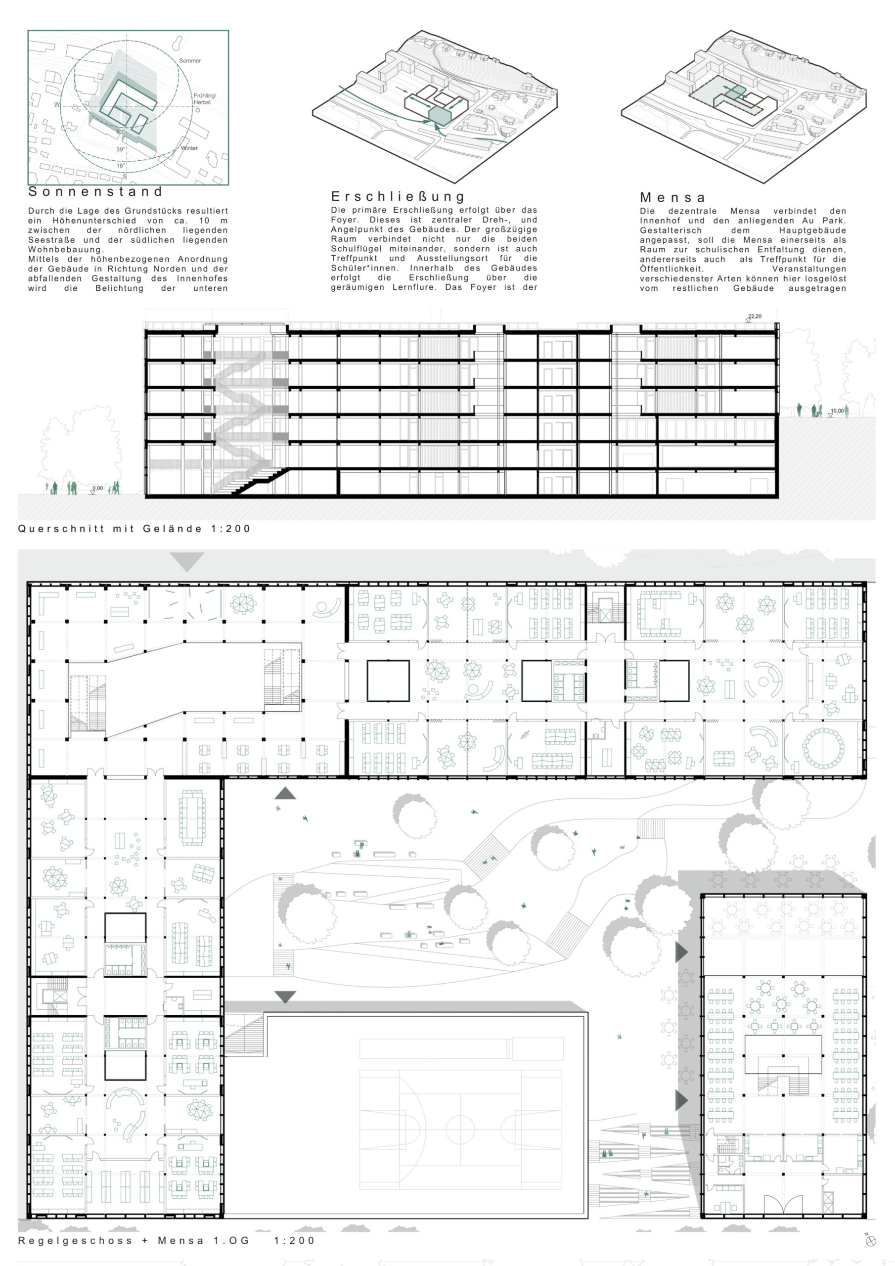 Zwischen den Hauptgebäuden liegt ein zentraler Innenhof, der durch unterschiedliche Ebenen vielfältige Aufenthaltsqualitäten bietet. Gefasst wird er von der teilweise eingegrabenen Sporthalle mit öffentlich nutzbaren Dachsportflächen sowie der Mensa, die als Bindeglied zwischen Schulgelände und angrenzendem Park fungiert und sowohl der Schule als auch der Nachbarschaft dient.