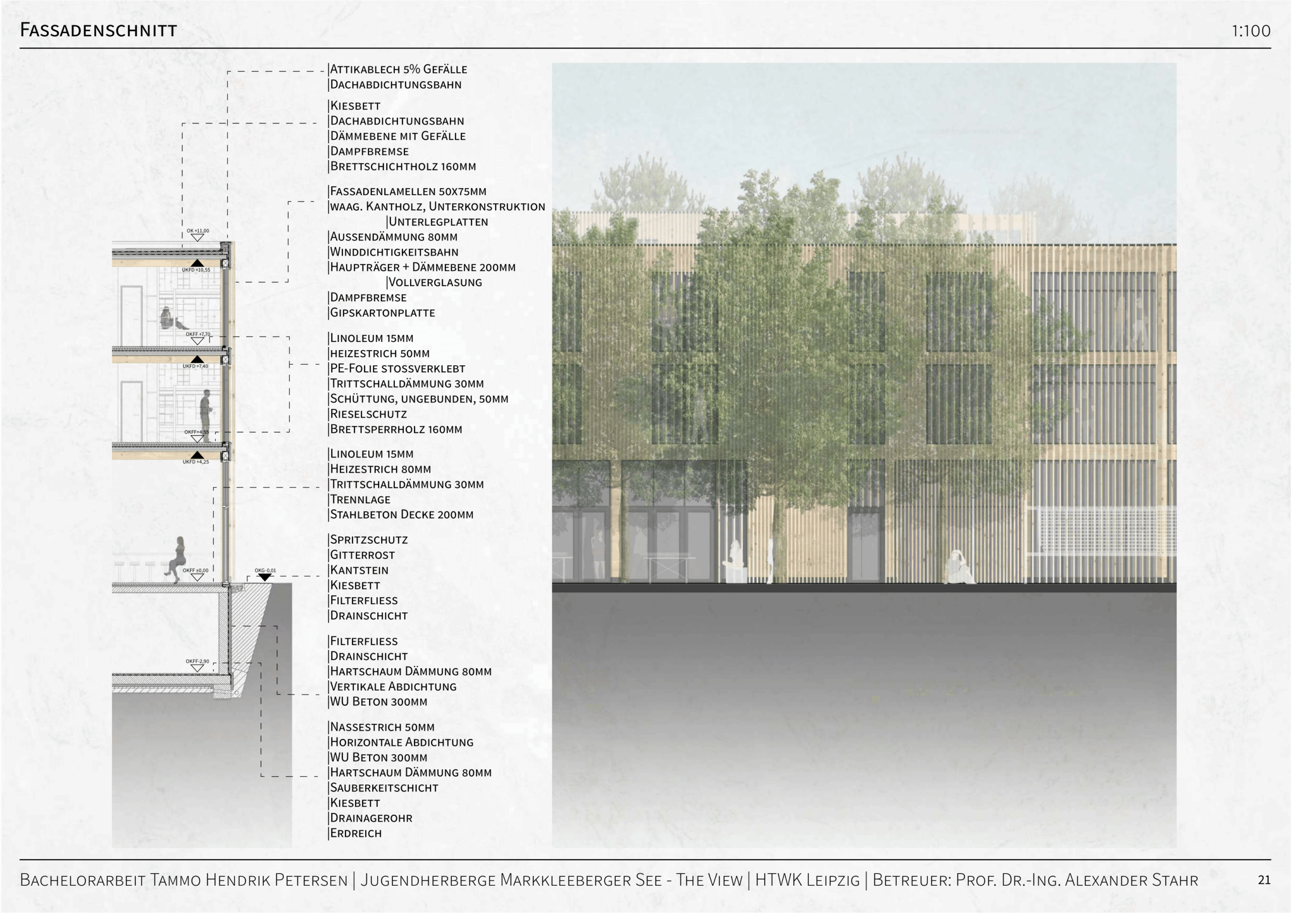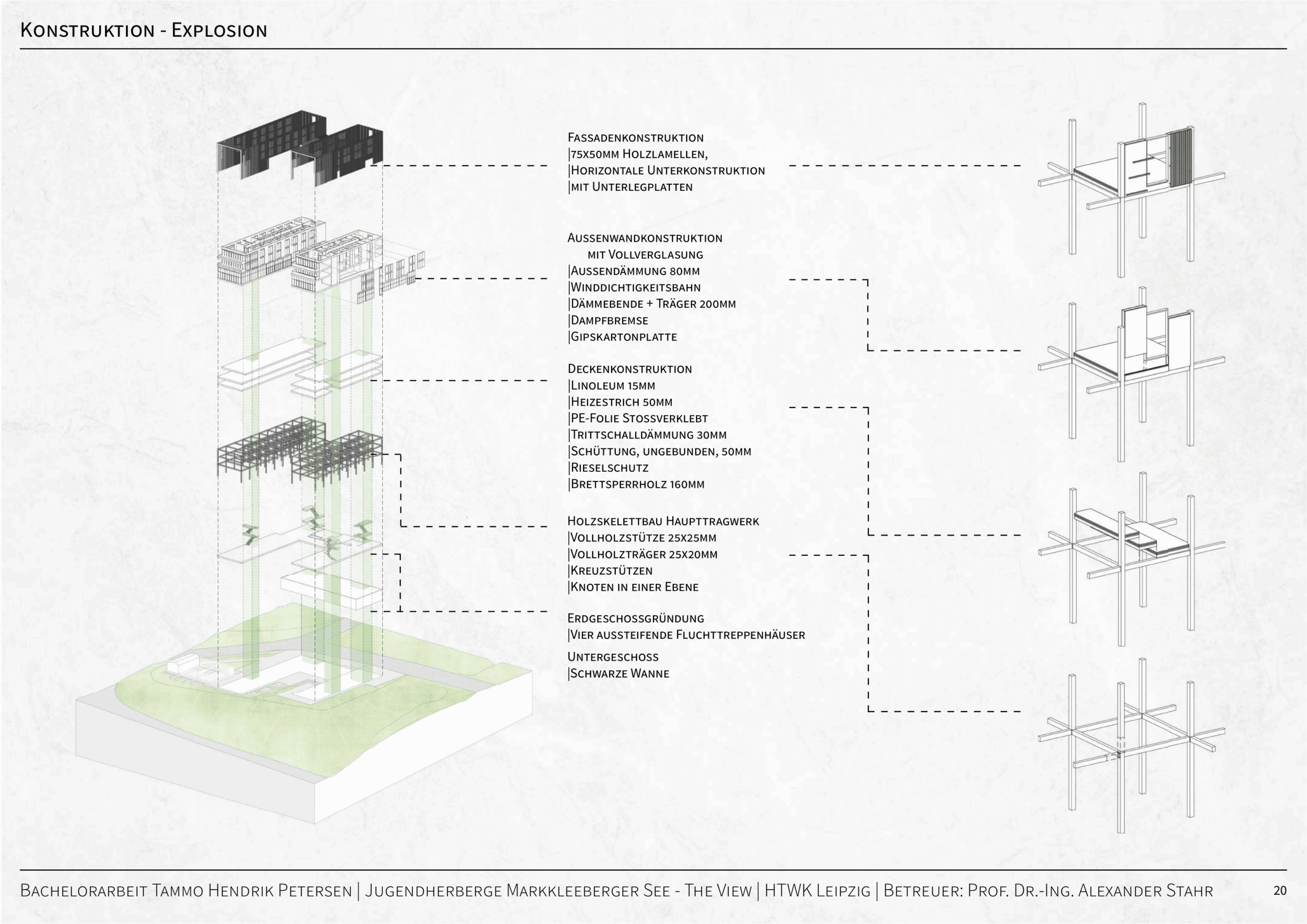 Konstruktiv ist das Gebäude als Holz-Hybrid-Bau konzipiert, wobei lediglich Treppenhäuser und erdberührte Bauteile in Beton ausgeführt sind. Die Fassade als Holzvorhangfassade macht durch unterschiedliche Tiefen die innere Struktur ablesbar, während im Innenraum ein ruhiges, neutrales Erscheinungsbild durch gezielte farbliche Akzente in den Clusterbereichen ergänzt wird.